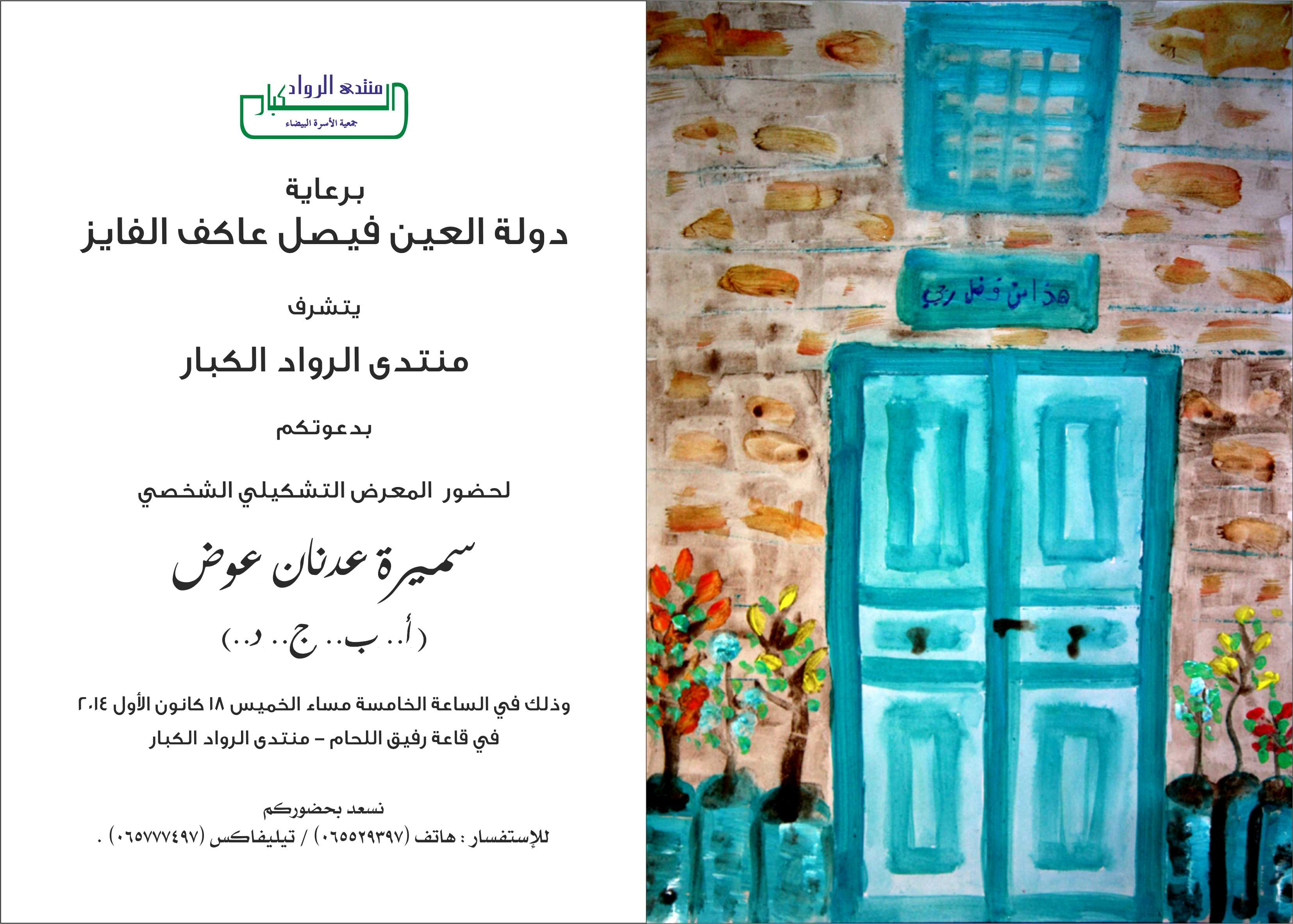 الاردن – عرب تليجراف – برعاية دولة العين فيصل عاكف الفايز يفتتح المعرض التشكيلي الشخصي للزميلة سميرة عدنان عوض بعنوان (أ.. ب.. ج.. د..)، في الخامسة مساء الخميس 18 كانون الأول، في قاعة رفيق اللحام- منتدى الرواد الكبار/ أم السماق.