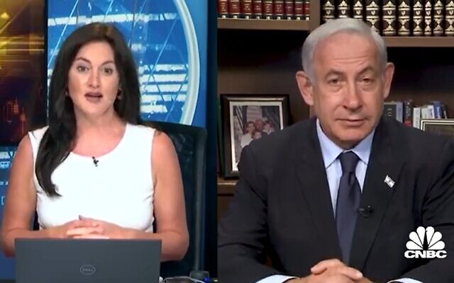 رئيس الوزراء بنيامين نتنياهو (يمين) يتحدث مع هادلي غامبل على قناة CNBC في 19 أبريل 2023 (Screencapture / CNBC)