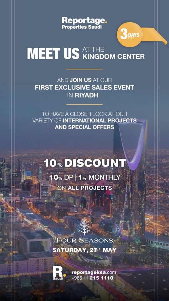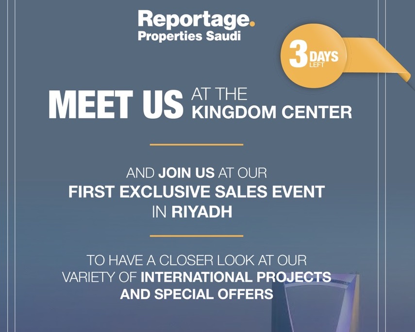 Reportage Properties, the leading UAE real estate developer, is organizing a special sales day at the Kingdom Tower in Riyadh, tomorrow, Saturday, May 27, which is the first sales activity organized by the company in the Kingdom of Saudi Arabia.