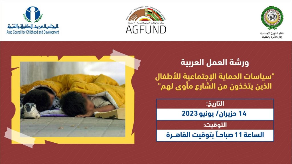بالشراكة بين الأمانة العامة لجامعة الدول العربية- إدارة الأسرة والطفولة، وبرنامج الخليج العربي للتنمية “أجفند”، والمجلس العربي للطفولة والتنمية، عقدت افتراضيا يوم 14 يونيو / حزيران 2023 ورشة العمل العربية “سياسات الحماية الاجتماعية للأطفال الذين يتخذون من الشارع مأوى لهم”. وذلك بمشاركة 70 مشارك من 14 دولة عربية يمثلون الآليات الوطنية للطفولة في الدول العربية، والمنظمات الوطنية والإقليمية والدولية، والجمعيات الأهلية ذات الصلة، والخبراء، والإعلام.