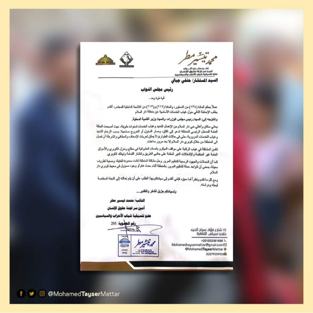 تقدم النائب البرلماني محمد تيسير مطر، بطلب إحاطة موجه إلى السيد رئيس مجلس الوزراء، والسيد وزير التنمية المحلية، حول أسباب غياب الخدمات الأساسية عن دار السلام، والإهمال الشديد الذي يعاني منه الحي منذ سنوات. وأوضح “مطر” في طلبه مدى سوء الوضع في دار السلام، حيث ينتشر الزحام والقمامة والمواقف العشوائية والإشغالات، في ظل غياب تام للرقابة أو للحملات المرورية، مما يعيق الدخول والخروج من وإلى الحي، حتى في حالات الطوارئ، مدخول سيارات المطافي والإسعاف. وطالب “مطر” بإحالة طلبه للجهة المختصة ومناقشته بشكل عاجل، نظرً ا لأهمية الموضوع.