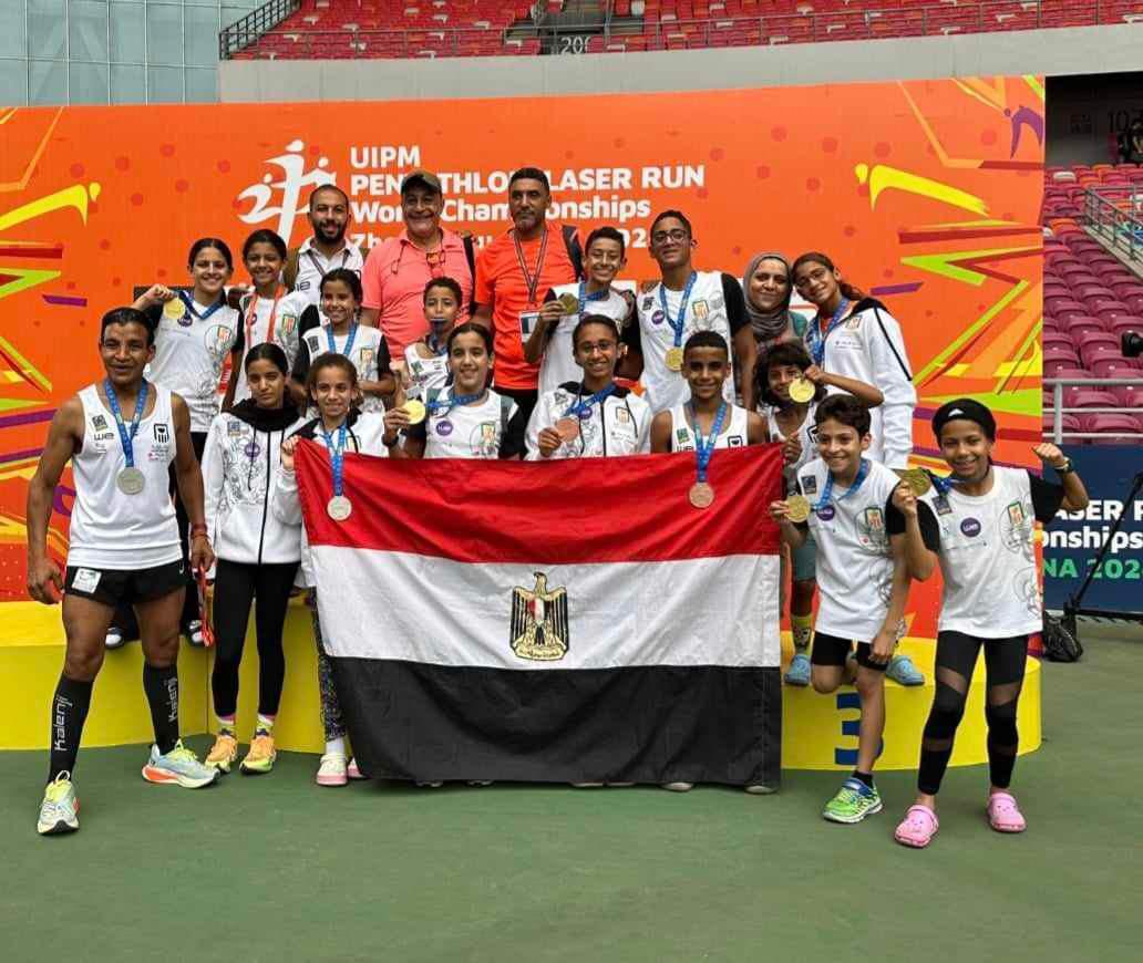 بعد أن حقق ابطال المنتخب المصري للخماسي الحديث 14 ميداليه لبعثة مصر ببطولة العالم لليزر- رن التي اقيمت في الصين خلال الفترة من 7 إلى 9 يونيو الجاري بمشاركة 550 لاعبًا يمثلون 24 دولة يتنافسون في المراحل العمرية من 9 سنوات حتى الماسترز +70.