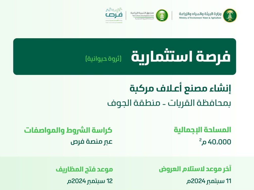 أعلنت وزارة البيئة والمياه والزراعة عن طرح فرصة استثمارية، لإنشاء مصنع أعلاف مركّبة على مساحة إجمالية تبلغ (40) ألف متر مربع، في محافظة القريات بمنطقة الجوف؛ بهدف رفع كفاءة الإنتاج الحيواني، وتحقيق الاكتفاء الذاتي من الأعلاف.
