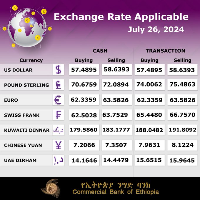 وفي يوم الجمعة الماضي، ذكر البنك التجاري الإثيوبي أن سعر شراء الدولار الأمريكي 57.48 بر، والبيع 58.64 بر.