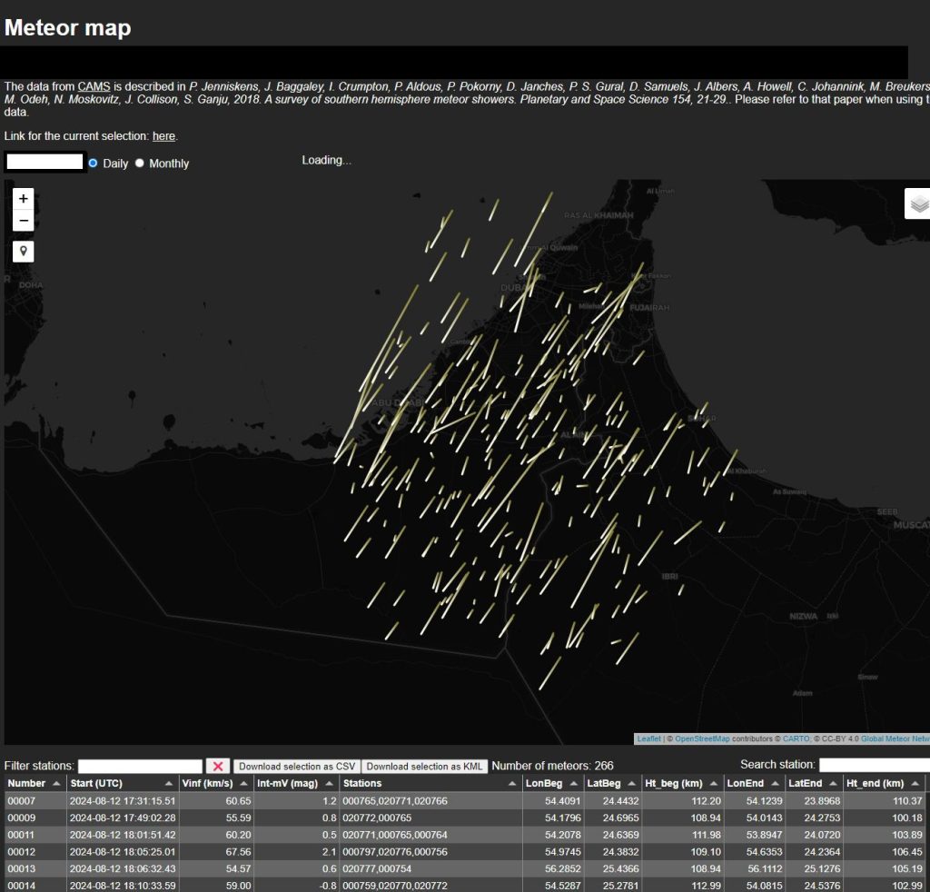 وبعد تصوير الشهب، تقوم المحطات بشكل آلي بتحليل الصور، وتحديد مسار ولمعان كل شهاب، وبعد ذلك ترسل المعلومات إلى مركز علمي متخصص في الولايات المتحدة في تعاون دولي يجمع المركز مع شبكات عالمية أخرى مماثلة بإشراف وكالة الفضاء الأمريكية “ناسا”. وتبين الصورة الأولى خارطة دولة الإمارات مبين عليها الشهب التي تم تصويرها خلال الليلة الماضية، حيث تبين الخارطة لكل شهاب الموقع الذي بدأ فيه بالظهور (الأصفر الداكن) والمكان الذي انتهى عنده الشهاب (الأبيض). كما ونرفق بعضا من صور الشهب المميزة التي تم تصويرها خلال الليلة الماضية.