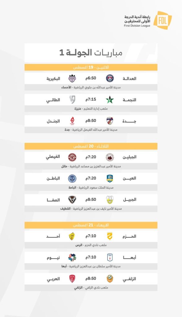 وتختتم الجولة الأولى يوم الأربعاء 21 أغسطس، حيث يلتقي الحزم مع أحد على ملعب نادي الحزم في الرس، الزلفي مع العربي على ملعب نادي الزلفي، فيما ستتجه الأنظار لمواجهة أبها مع نيوم صاحب الصفقات القوية خلال فترة الانتقالات الصيفية، وهي المواجهة التي ستقام على ملعب مدينة الأمير سلطان بن عبدالعزيز الرياضية في أبها.