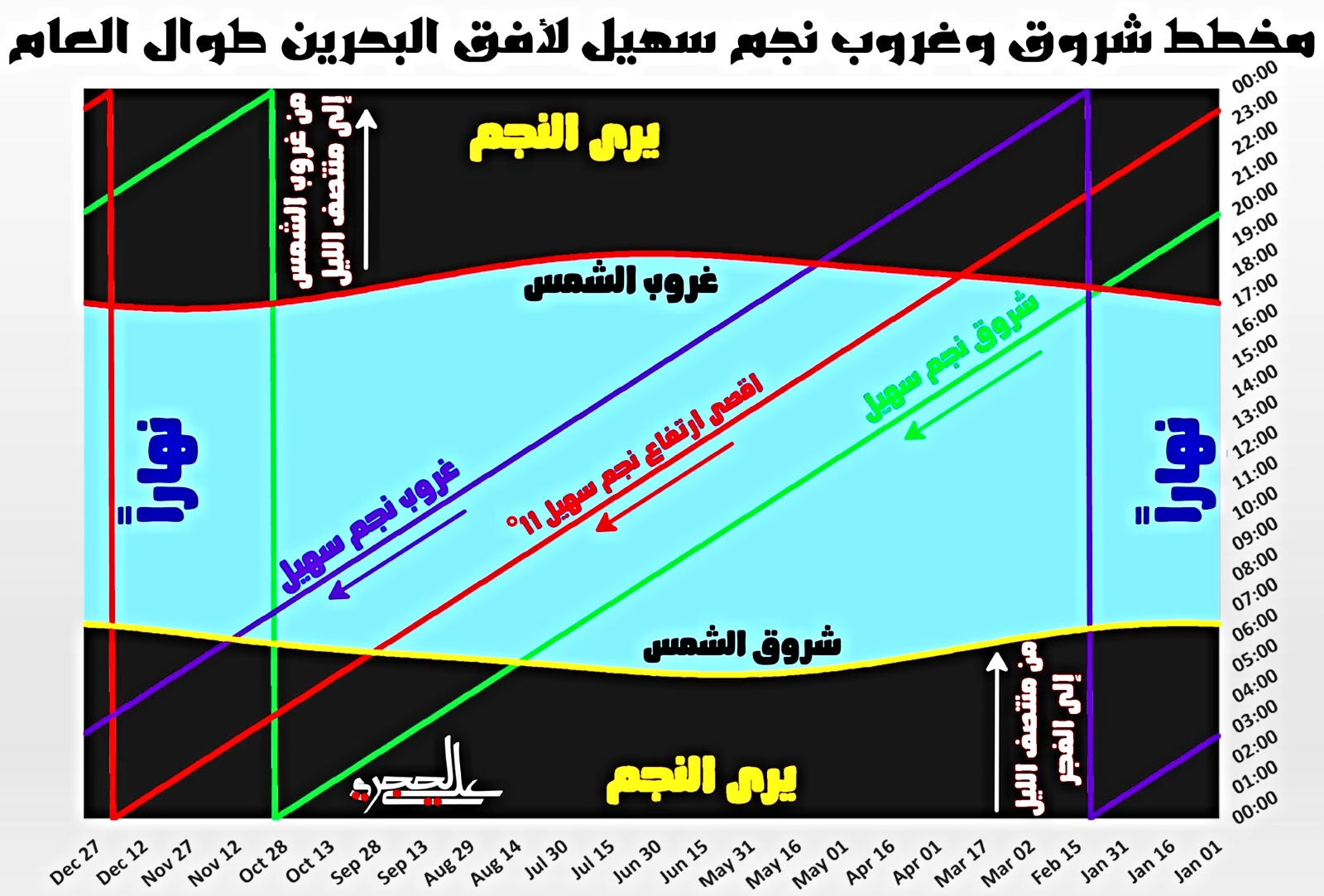 وختم الحجري بأن نجم سهيل من النجوم الجنوبية للكرة الأرضية أي انه لا يرى من بعد خط عرض 37 درجة و17 دقيقة شمالاً وهو تحت الأفق دائماً، بينما يشرق ويغرب سهيل ما بين خط عرض أقل من 37 درجة و17 دقيقة شمالاً إلى 37 درجة و17 دقيقة جنوباً، ولا يغيب عن الأفق كلما انتقلنا إلى الجنوب وصولا إلى القطب الجنوبي للكرة الأرضية، لذلك لكل خط عرض للكرة الأرضية يرصد سهيل على اقصى ارتفاع مختلف في السماء ولفترات ظهور متفاوتة من السنة، ويكون اقصى ارتفاع له لافق البحرين على 11 درجة و8 دقائق.