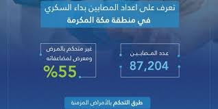 أظهرت إحصائية حديثة صادرة عن إدارة الصحة السكانية بتجمع مكة المكرمة الصحي، أن عدد المصابين بداء السكري بمنطقة مكة المكرمة 87.204 شخص مصاب، 55% منهم غير متحكم بالمرض ومعرض لمضاعفاته.