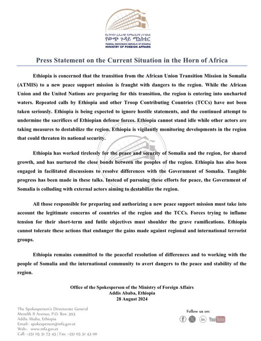 وقالت الخارجية الإثيوبية في بيان: “بشأن الأوضاع الراهنة في منطقة القرن الأفريقي، تعرب إثيوبيا عن القلق من أن يشكل الانتقال من بعثة الاتحاد الأفريقي الانتقالية في الصومال (أتميس) إلى بعثة جديدة لدعم السلام خطرًا على استقرار المنطقة”.
