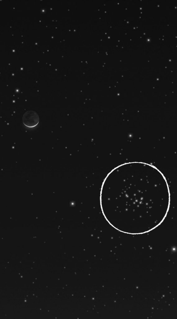 القمر سوف يضيء أعلى يسار العنقود بحيث سيكونان قريبين من بعضهما بدرجة كافية ليظهرا سويا في مجال رؤية المنظار حيث يمكن رؤية عشرات النجوم من هذا العنقود.