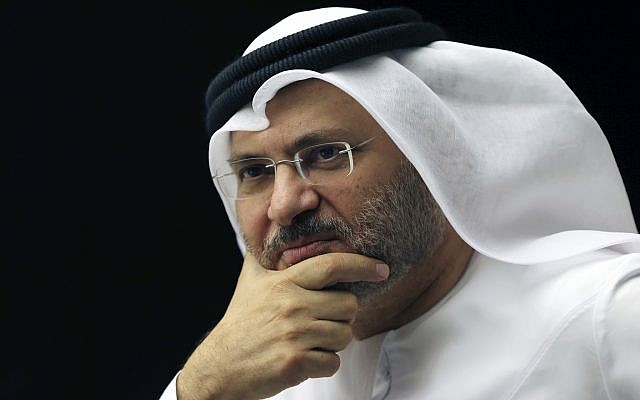 أنور قرقاش، وزير الدولة الإماراتي للشؤون الخارجية آنذاك، يتحدث إلى وسائل الإعلام خلال مؤتمر صحفي في دبي، الإمارات العربية المتحدة