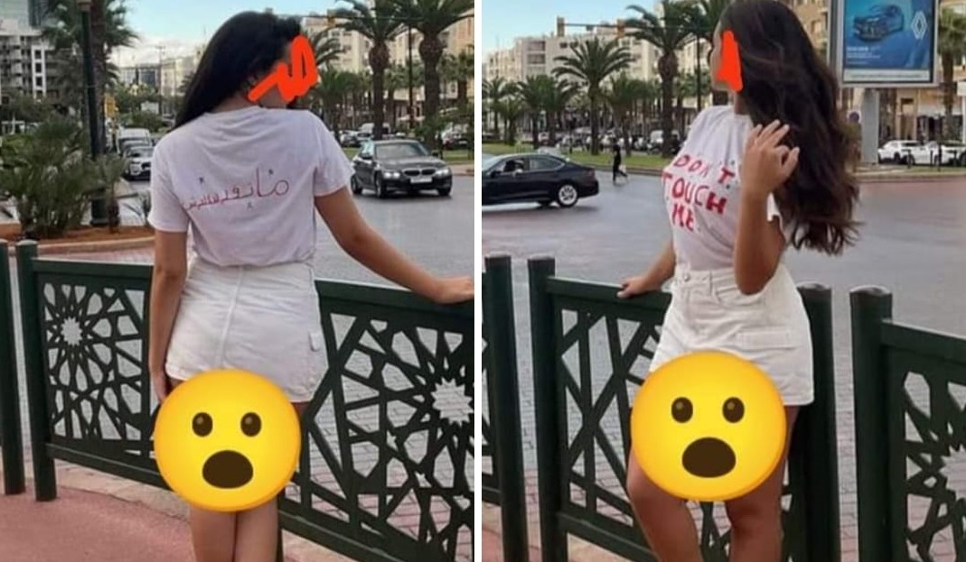 تضامنا مع فتاة طنجة العارية التي حاول قاصرون تجريدها من ملابسها بطنجة ، خرجت علينا فتاة ترتدي تنورة قصيرة مع تيشورت مكتوب عليه بالعربية والفرنسية كلمة : “ما تقيسنيش ” .