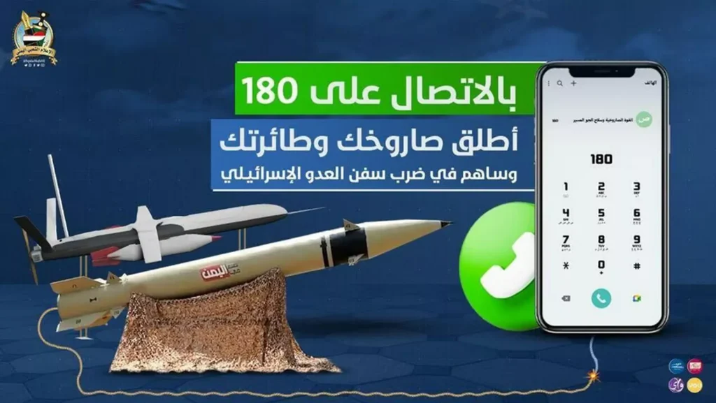 ويقترح إعلان آخر “اتصل بالرقم 180، وأطلق صاروخك أو طائرتك بدون طيار وساهم في ضرب سفن العدو الإسرائيلي”، مع عرض صور لفتيل يربط هاتفًا بصاروخ يستعد للإطلاق.