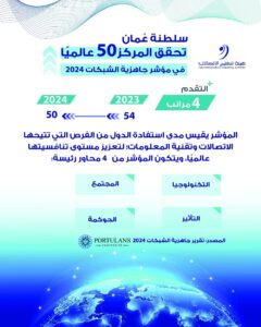 تقدّمت سلطنة عُمان 4 مراتب في مؤشر جاهزية الشبكات 2024؛ محققة المركز 50 عالميًا مقارنة بالمركز 54 في العام المنصرم 2023، حيث يقيس المؤشر مدى استفادة الدول من الفرص التي تتيحها الاتصالات وتقنية المعلومات لتعزيز مستوى تنافسيتها عالميًا، ويتكون المؤشر من 4 محاور رئيسة، هي التكنولوجيا، والمجتمع، والتأثير، والحوكمة.