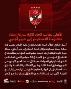وأعلن الأهلي في بيان رسمي أنه خاطب الاتحاد المصري لكرة القدم يطالبه بسرعة إسناد مسؤولية وإدارة لجنة الحكام إلى خبير أجنبي، يملك سيرة ذاتية تؤهله لهذه المهمة.