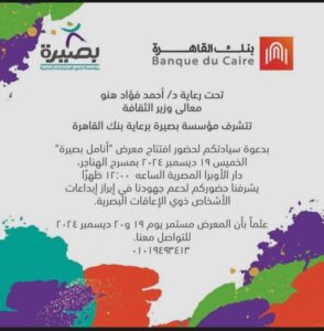 ندعوكم لحضور معرض يقام لأول مرة… أنامل بصيرة… هي أول خطوة علي طريق الحلم لأطفالنا ذوي الاعاقة البصرية حيث يبرز إبداعاتهم ومواهبهم المتميز تحت رعاية د /خالد فؤاد هنو وزير الثقافة وبرعاية بنك القاهرة