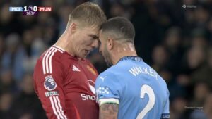 – في الدقيقة 39، دفع كايل ووكر مهاجم المنافس، راسموس هويلوند، خلال تنافسهما على الكرة، قبل أن يتشاجرا فيما بينهما، قبل أن يسقط ظهير فريق “السيتيسينز” على الأرض مدعيًا أنه تعرض لنطحة في الرأس ثمّ اندلع اشتباك بين اللاعبين، قبل أن ينجح الحكم في فض الاشتباك ويشهر البطاقة الصفراء بوجه الثنائي.