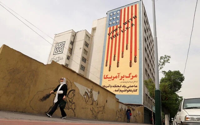 نساء يسرن بالقرب من مبنى عليه جدارية معادية للولايات المتحدة كتب عليها شعار ”تسقط أمريكا“ وجماجم تحل محل النجوم على علم الولايات المتحدة، في شارع كريم خان زند بطهران