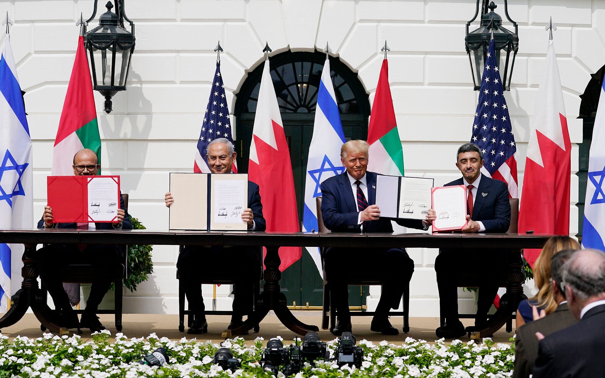 وزير خارجية البحرين خالد بن أحمد آل خليفة، رئيس الوزراء بنيامين نتنياهو، الرئيس الأمريكي آنذاك دونالد ترامب، ووزير خارجية الإمارات عبد الله بن زايد آل نهيان، خلال مراسم توقيع اتفاقيات “أبراهام” في الحديقة الجنوبية للبيت الأبيض، في واشنطن
