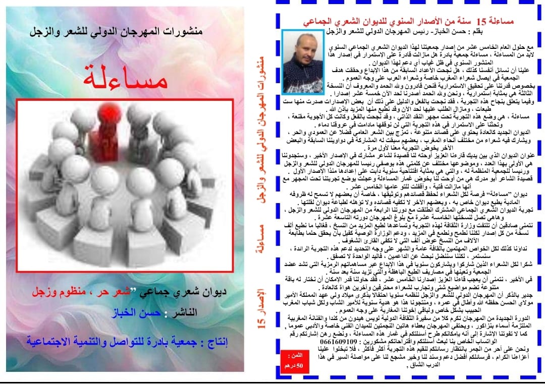وتتميز الدورة الجديدة بصدور الإصدار الخامس عشر من الديوان الشعري الحماعي الذي يصدر ضمن منشورات المهرجان الدولي للشعر والزجل كل سنة ويشارك فيه عشرات الشعراء المغاربة والعرب ، والذي اختارت له اللجنة المنظمة هذا العام كعنوان “مساءلة” .