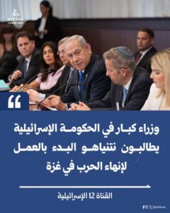 وزراء كبار في الحكومة يطالبون نتنياهو البدء بالعمل لإنهاء الحرب في غزة.