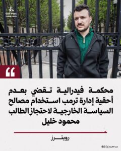 محكمة فيدرالية تقضي بعدم أحقية إدارة ترمب استخدام مصالح السياسة الخارجية لاحتجاز الطالب محمود خليل
