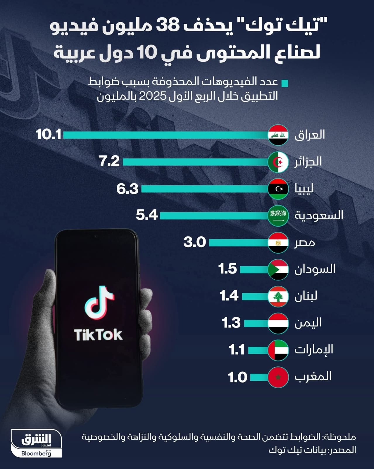 الخطير في الامر ان هذه الدول العربية تفوقت على أخرى أكبر منها من حيث عدد السكان، بل حتى على دول مثل الولايات المتحدة والبرازيل، في عدد المقاطع التي حذفتها “تيك توك” خلال الفترة ذاتها.