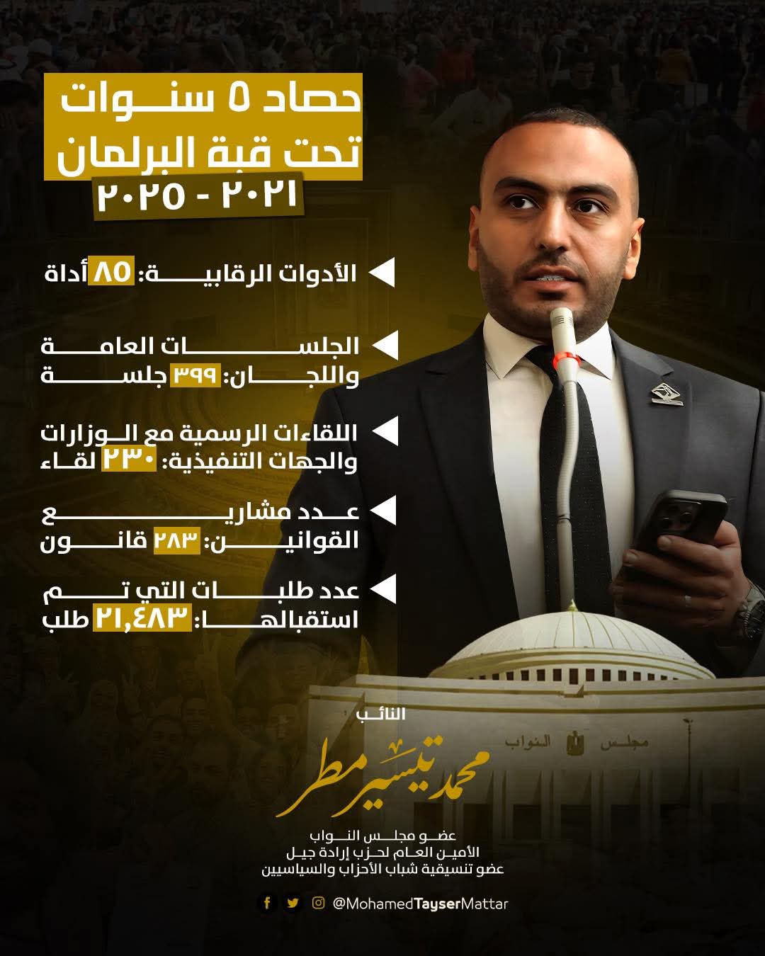 5 سنوات بلا كلل، بذل فيها النائب البرلماني محمد تيسير مطر، عضو مجلس النواب عن تنسيقية شباب الأحزاب والسياسيين، داخل قبة البرلمان، كل الجهد، سبيلا لخدمة المواطنين وتمثيلا مشرفا للشعب المصري عامة، وأهالي دائرته بشكل خاص، سعى خلالها للقيام بدوره الرقابي والخدمي، باستخدام كافة الأدوات المتاحة، والتعاون مع الجهات التنفيذية المختلفة، لرفع مستوى الخدمات المقدمة للمواطنين.