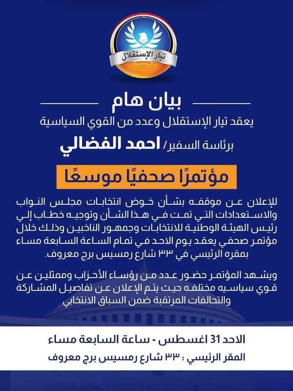 للإعلان عن موقفه بشأن خوض انتخابات مجلس النواب والاستعدادات التي تمت في هذا الشأن وتوجيه خطاب إلي رئيس الهيئة الوطنية للانتخابات وجمهور الناخبين وذلك خلال مؤتمر صحفي يعقد يوم الاحد في تمام الساعة السابعة مساء بمقره الرئيسي في ٣٣ شارع رمسيس برج معروف.