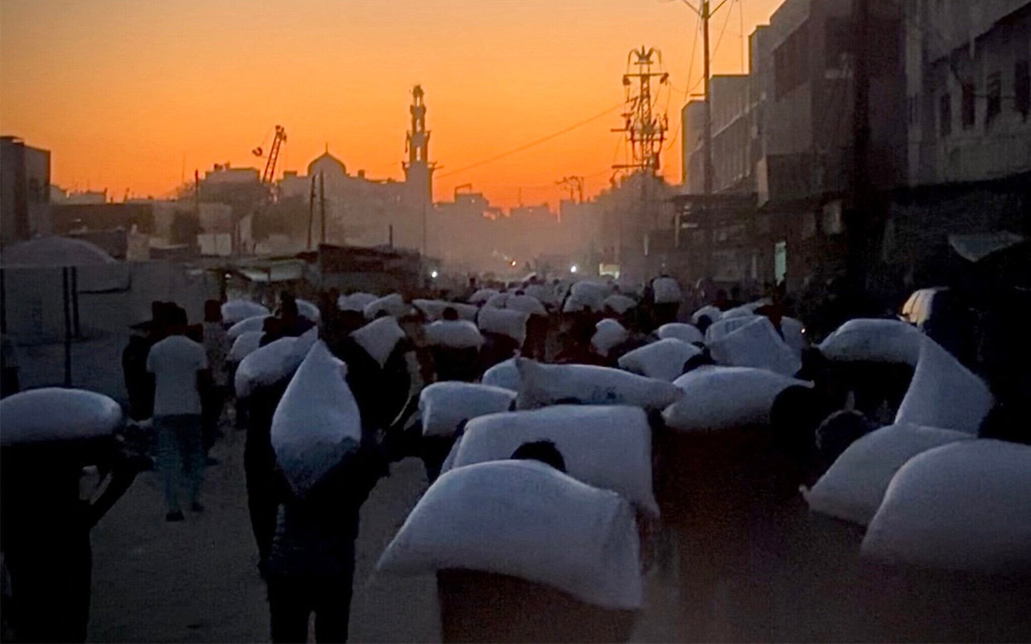 رجال يحملون أكياس الدقيق التي تم أخذها من شاحنة محملة بالمواد الغذائية، في خان يونس في جنوب قطاع غزة