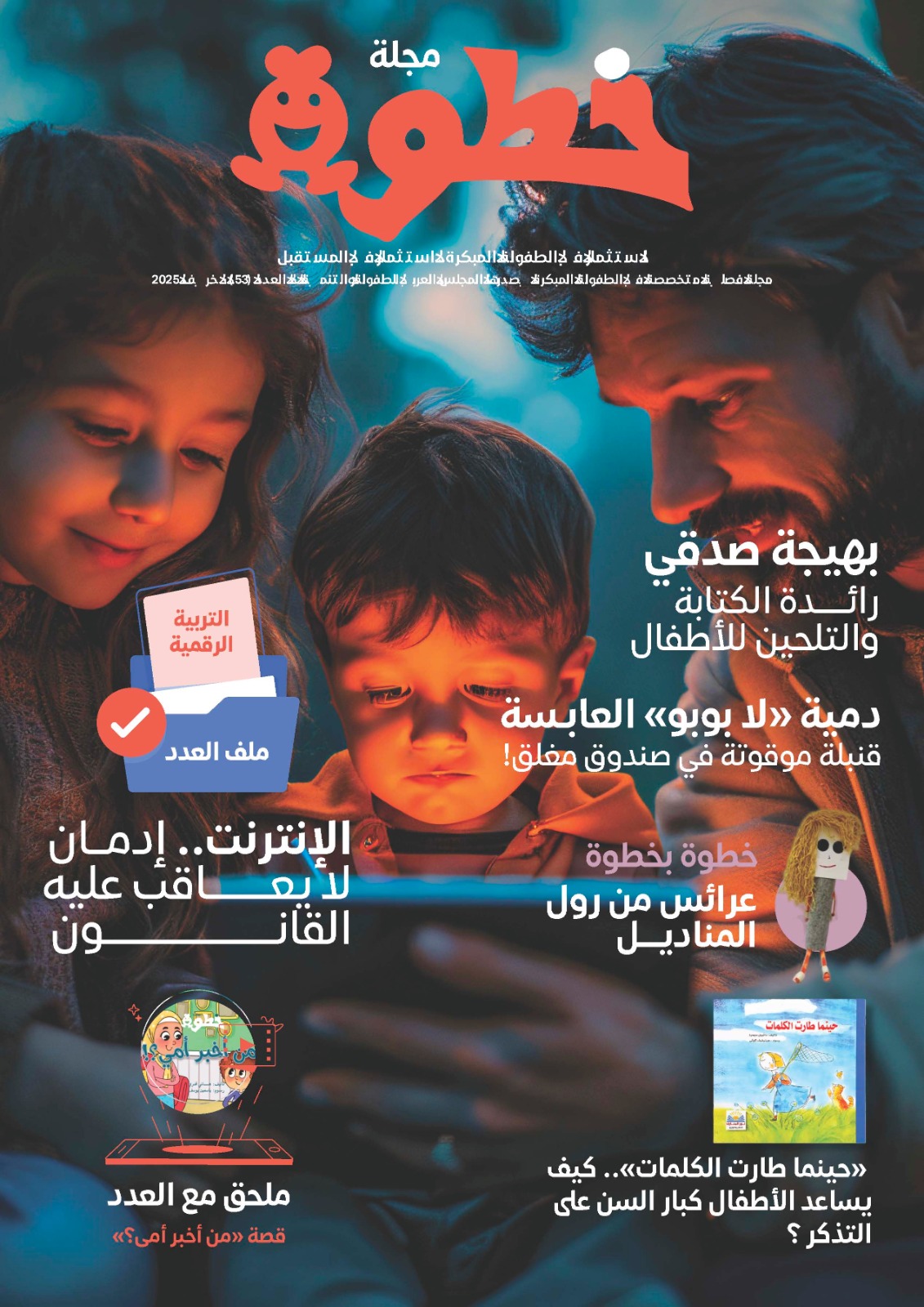أكد الدكتور حسن البيلاوي أمين عام المجلس العربي للطفولة والتنمية والمشرف العام على مجلة خطوة في افتتاحية العدد (53) بأنه ما من شك في أن مرحلة الطفولة المبكرة تعد حجر الأساس في بناء شخصية الإنسان وقدراته المستقبلية، فهي المرحلة التي تبدأ فيها رحلة البحث والاكتشاف والفضول، وتتكون فيها أولى البذور المعرفية والاجتماعية والتربوية. وانطلاقًا من دور مجلة خطوة للتعريف بأهمية الاستثمار في الطفل خاصة في هذه المرحلة الهامة، تتواصل رسالتها العلمية والمهنية بتقديم محتوى علمي وعملي يستند إلى أحدث الممارسات التربوية، ويسهم في دعم كل من يعمل ويتعامل مع طفل هذه المرحلة؛ من مربين وأولياء أمور وباحثين ومهتمين. مضيفا سعادته بأن هذا العدد جاء ملفه حول موضوع “التربية الرقمية” ادراكا أننا اليوم نعيش عالما يتسارع فيه التحول الرقمي، ولنؤكد على أهمية إعداد الطفل لبيئة رقمية آمنة وثرية، تعزز مهاراته دون أن تهدد نموه أو تنتهك حقوقه.