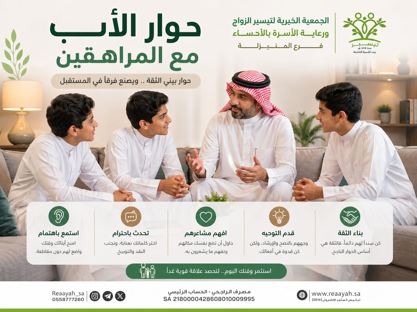نظّمت الجمعية الخيرية لتيسير الزواج ورعاية الأسرة فرع المنيزلة ، ضمن سلسلة أسرة مطمئنة، أمسية توعوية بعنوان “أهمية الحوار مع المراهقين وفوائده”، وذلك مساء يوم الأحد والاثنين 26 – 27 أبريل 2026م، عبر منصة (Zoom)، بحضور عدد 287 من المهتمين والمهتمات بالشأن الأسري والتربوي.