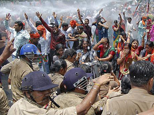 Indian police used water cannon to disperse protesters rallying outside the office of Uttar Pradesh’s Chief Minister Akhilesh Yadav, in the state capital Lucknow.