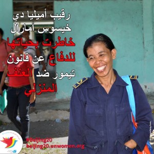 أميليا دى خيسوس: خاطرت بحياتها للدفاع عن قانون تيمور ضد العنف المنزلى، هي من أشد المدافعين عن المساواة والتصدي للعنف ضد النساء في جمهورية تيمور الشرقية الواقعة في جنوب شرق آسيا, كل عملها ينصب لدعم قانون يحمي النساء من مخاطر العنف المنزلي و نشر الوعي و تغيير الثقافة الريفية لتحترم النساء أكثر في مجتمعها, فهي تقود مسافة 7 ساعات كل يوم لتصل الي مقر عملها في العاصمة.