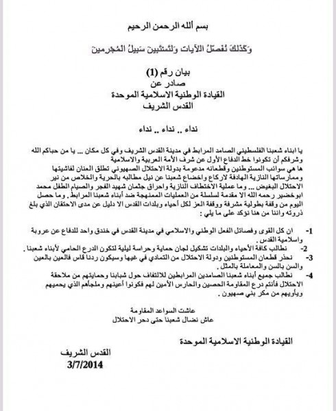 في خطوة تؤشّر على بدء انتفاضة ثالثة في الاراضي الفلسطينية المحتلة، تبدأ من القدس، أعلنت القوى والفصائل الوطنية والاسلامية في القدس المحتلة عن ميلاد “القيادة الوطنية الاسلامية الموحدة” في القدس، وأصدرت بيانها الأول عقب استشهاد الطفل محمد أبو خضير بعد التمثيل بجثته وحرقها.